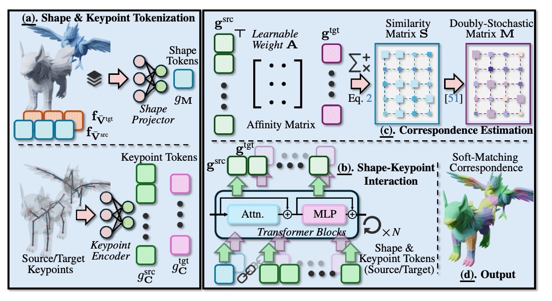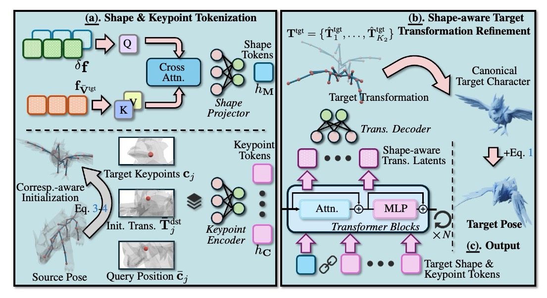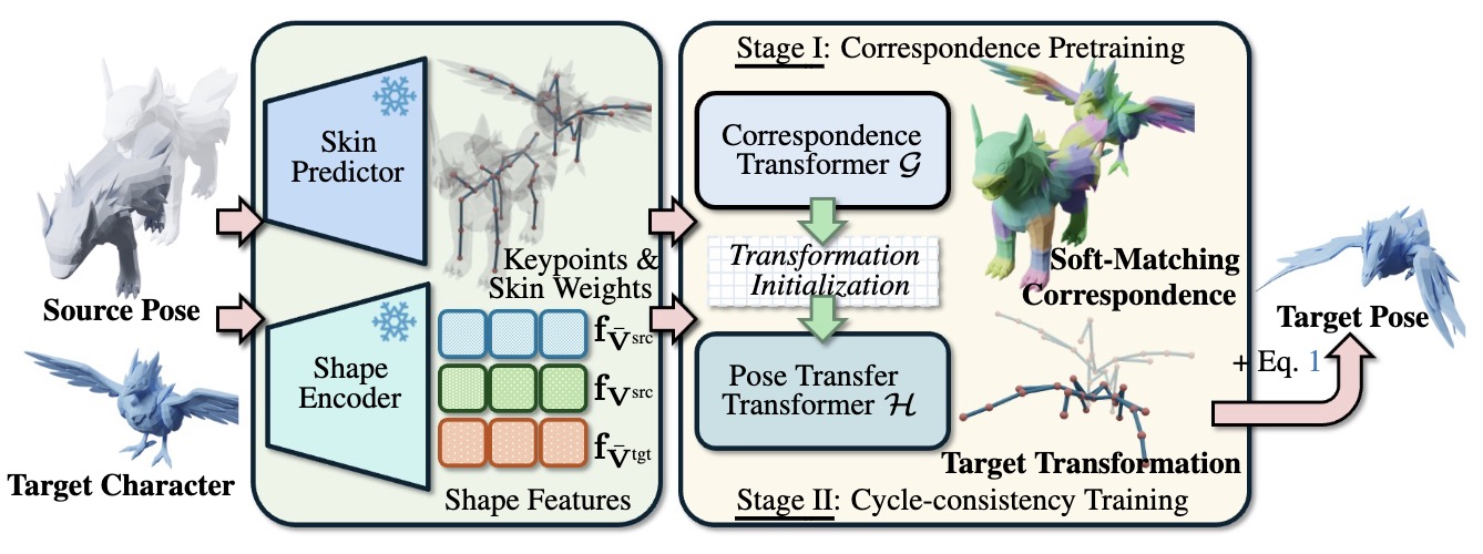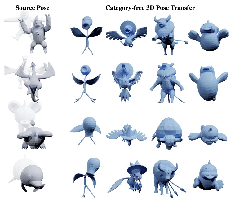 To address these issues, we first construct a million-scale pose dataset across hundreds of distinct characters. We further propose To address these issues, we first construct a million-scale pose dataset across hundreds of distinct characters. We further propose MimiCAT, a cascade-transformer model designed for category-free 3D pose transfer. Instead of relying on strict one-to-one correspondence mappings, MimiCAT leverages semantic keypoint labels to learn a novel soft correspondence that enables flexible many-to-many matching across characters. The pose transfer is then formulated as a conditional generation process, in which the source transformations are first projected onto the target through soft correspondence matching and subsequently refined using shape-conditioned representations. Extensive qualitative and quantitative experiments demonstrate that MimiCAT generalizes plausible poses across diverse character morphologies, surpassing prior approaches restricted to narrow-category transfer (e.g., humanoid-to-humanoid)., a cascade-transformer model designed for category-free 3D pose transfer. Instead of relying on strict one-to-one correspondence mappings, MimiCAT leverages semantic keypoint labels to learn a novel soft correspondence that enables flexible many-to-many matching across characters. The pose transfer is then formulated as a conditional generation process, in which the source transformations are first projected onto the target through soft correspondence matching and subsequently refined using shape-conditioned representations.